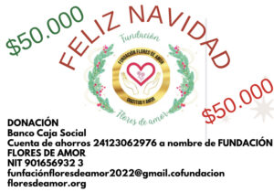 La Navidad, nos trae lindos recuerdos y esperanza en un futuro mejor.  Todos podemos compartir y regalar cariño y una sonrisa a personas que con el tiempo y bajo circunstancias, en ocasiones, inexplicables, están solos, viviendo de los recuerdos de su juventud, del cansancio de los años y de la ingratitud, no solo de la sociedad sino de su familia.  Por eso la FUNDACIÓN FLORES DE AMOR, en su deseo de acompañar y dar cariño a algunos adultos mayores de la localidad de Bosa en Bogota, D.C. Colombia, quiere celebrarles la navidad, para ello, hacemos un llamado a la generosidad  y solidaridad de las personas de buena voluntad que deseen aportar desde $50.000, como un acto de agradecimiento y amor por estas personas, que a través de los años han forjado el futuro de nuestro país.