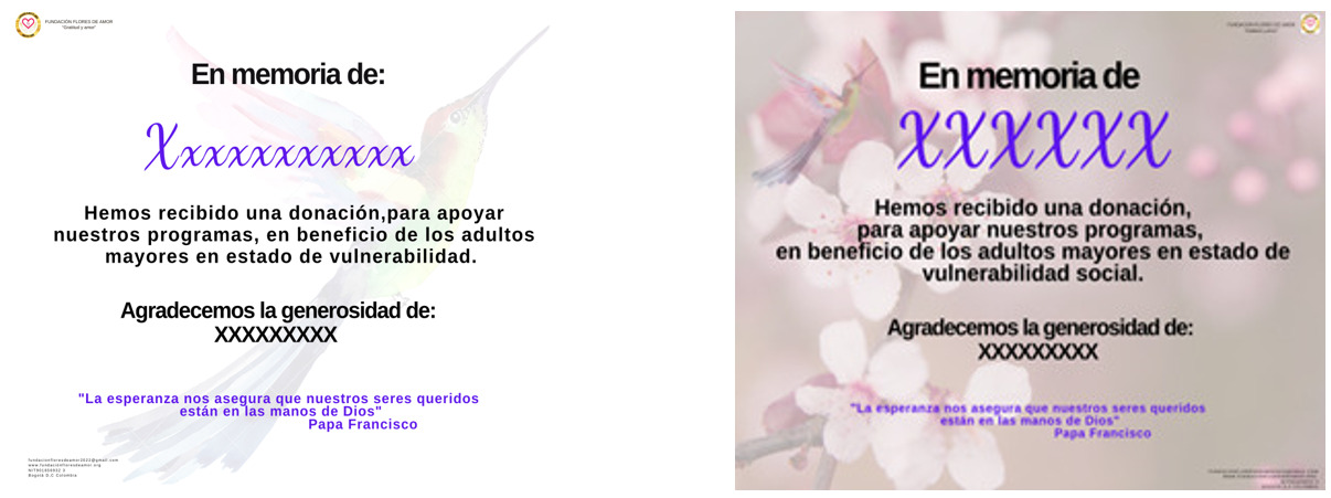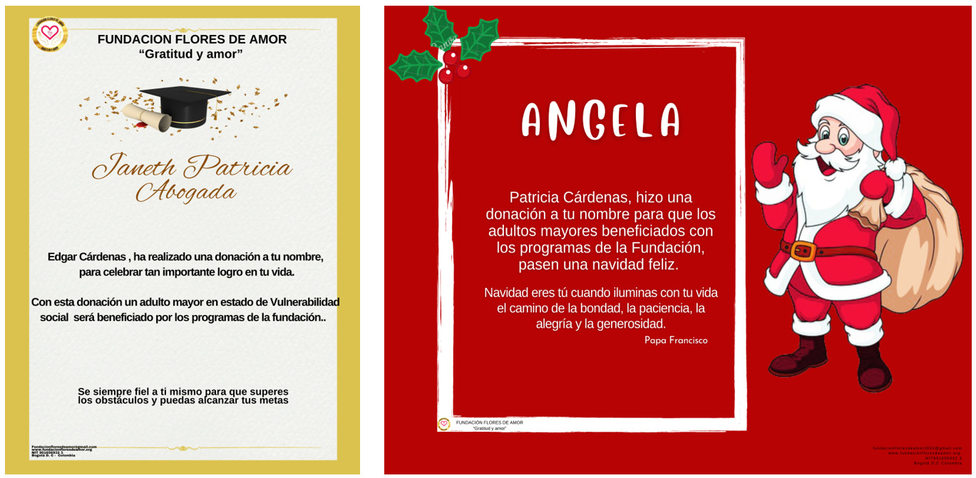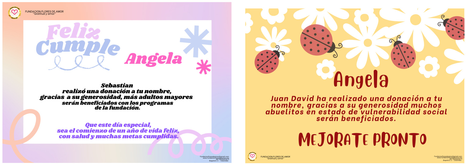 Los bonos personalizados de la FUNDACIÓN FLORES DE AMOR, son una excelente idea para demostrar cariño a una persona especial en cualquier momento de la vida, cambiar un regalo por un bono, que represente amor, alegria, agradecimiento, celebración o apoyo, es la mejor manera de ayudar al bienestar de los adultos mayores.